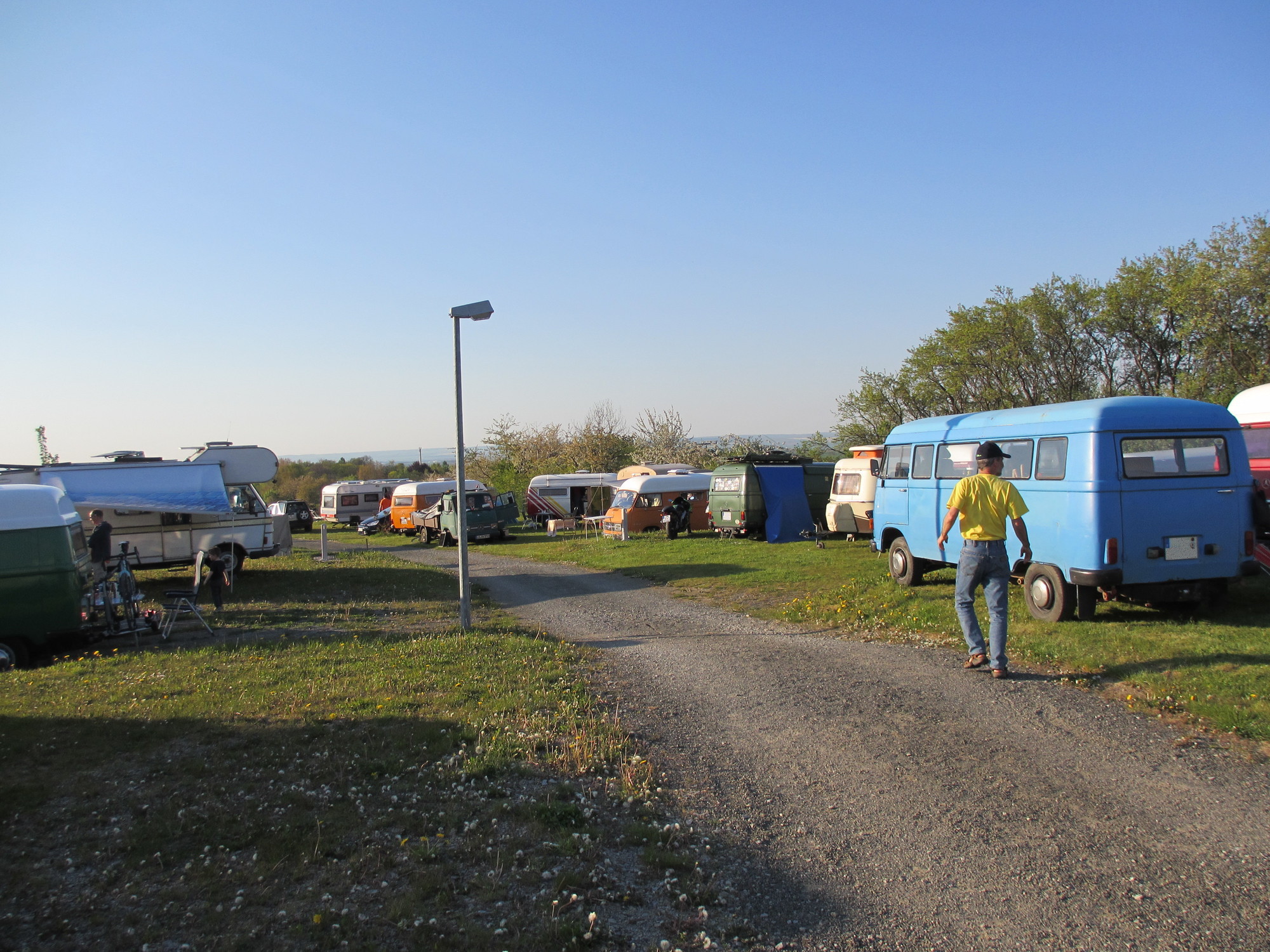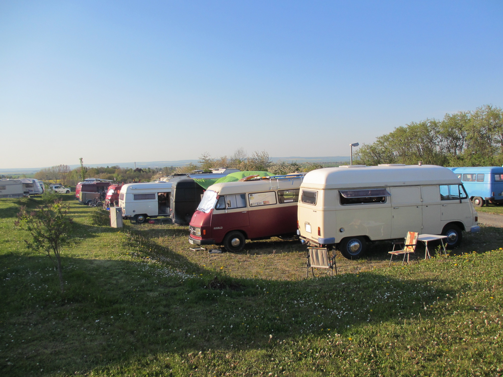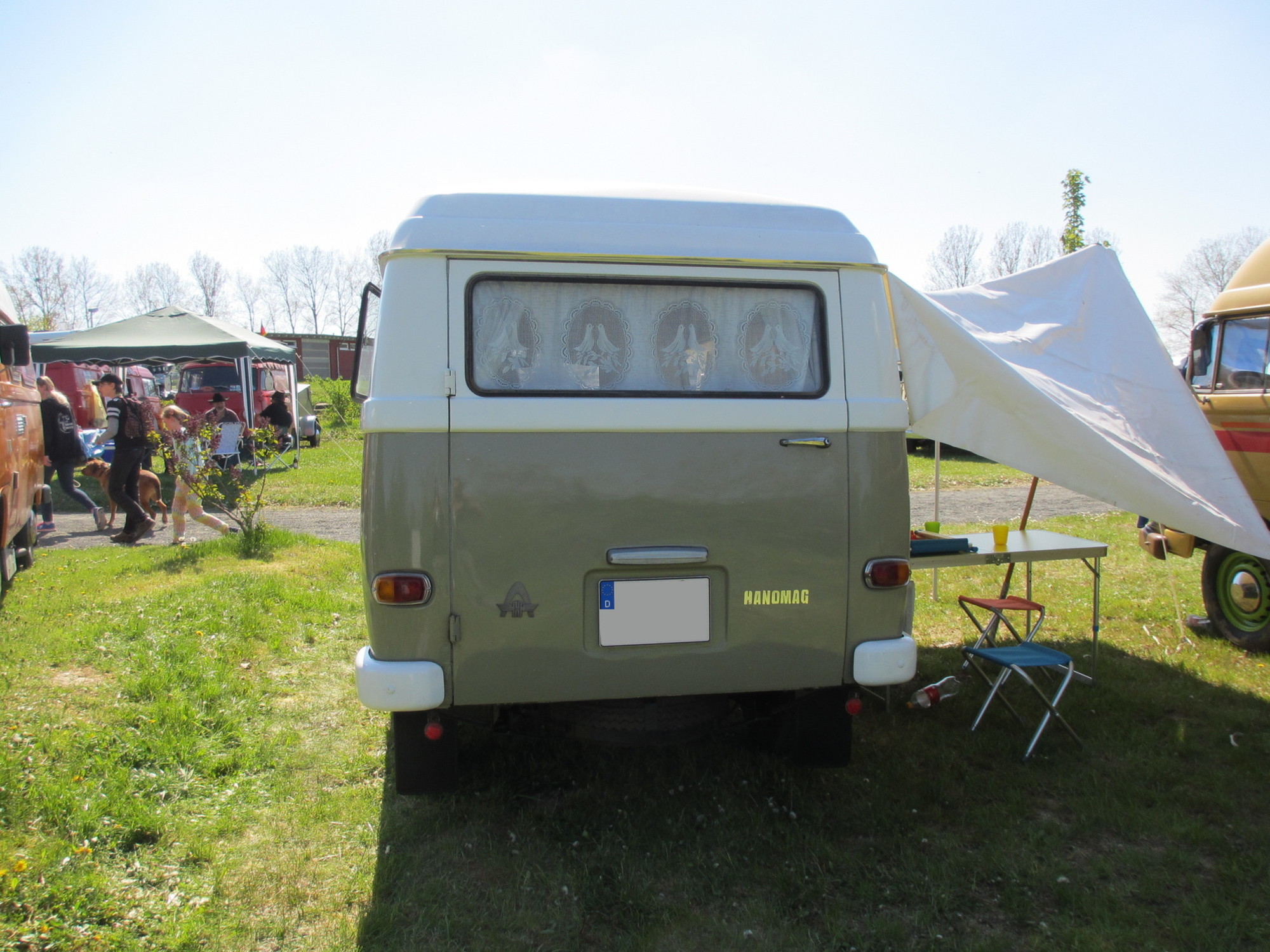 Gegenüber residierte Werner aus Unterfranken mit seiner Truppe und allein 5 Hanos. Werner ist ein in der Szene bekannter Schrauber, Ersatzteil-Sammler und Experte für alles Hano-mässige und besitzt laut eigener Aussage rund 30 Hanos. Werners Sohn kam auch gleich rüber, legte sich vorne unter den Bus und meinte "auch ein Kandidat für Zusatzfedern". Genau, die Zusatzfedern, die den Bus vorne etwas "hochheben" und damit mehr Bodenfreiheit verschaffen und so die Drehstabfedern entlasten, sollte ich auch mal einbauen. Ein Projekt für den Herbst oder Winter ...