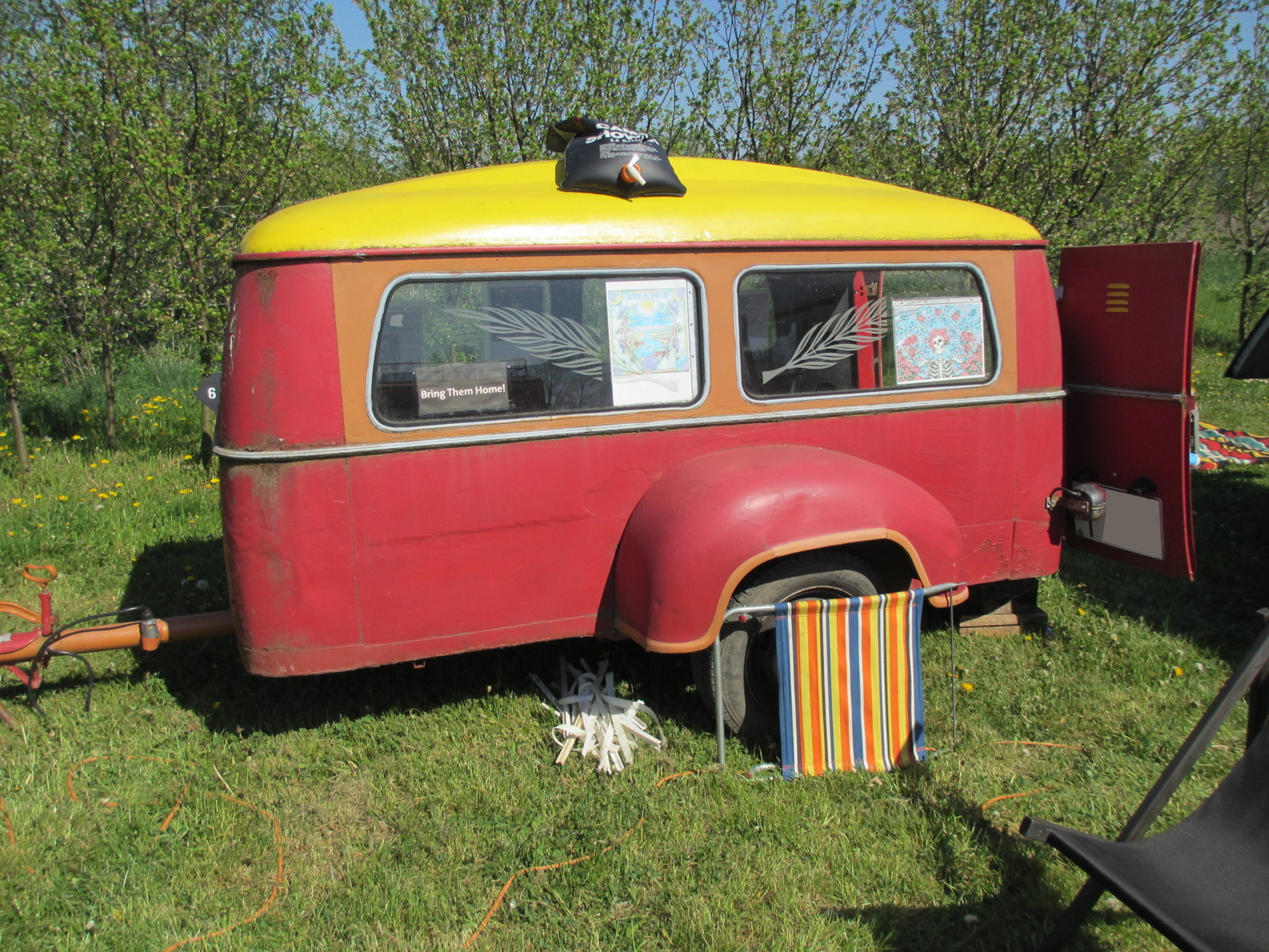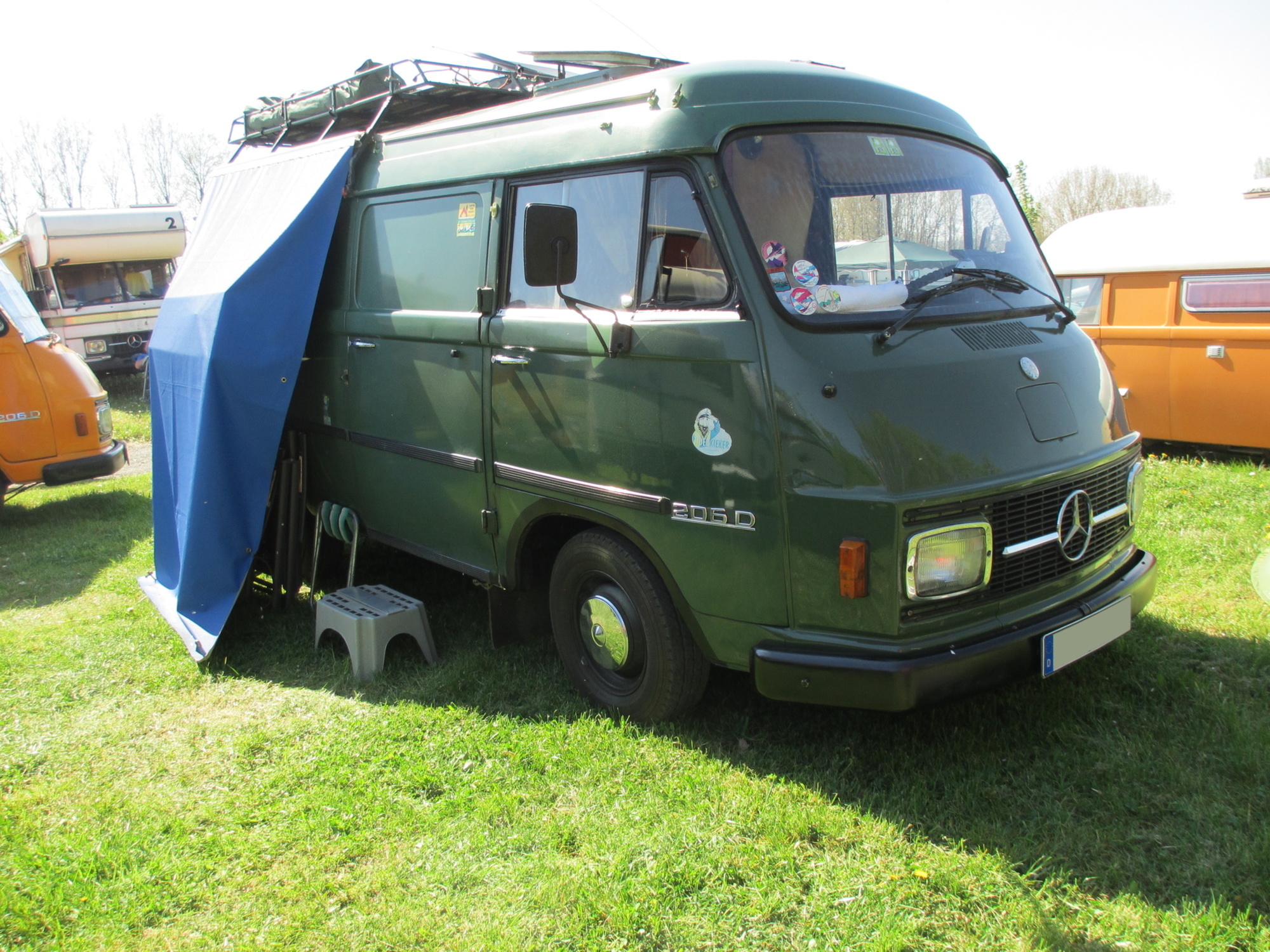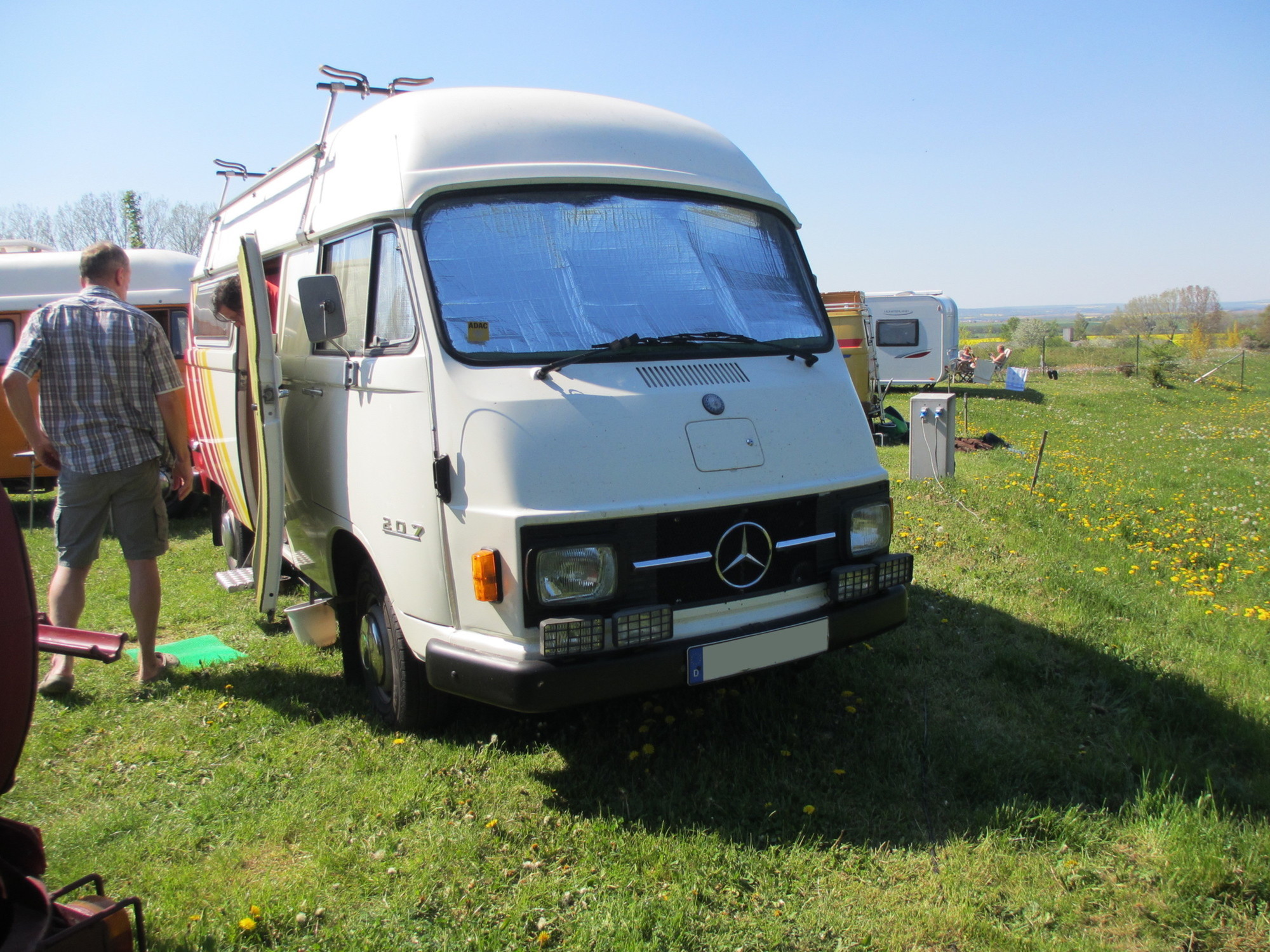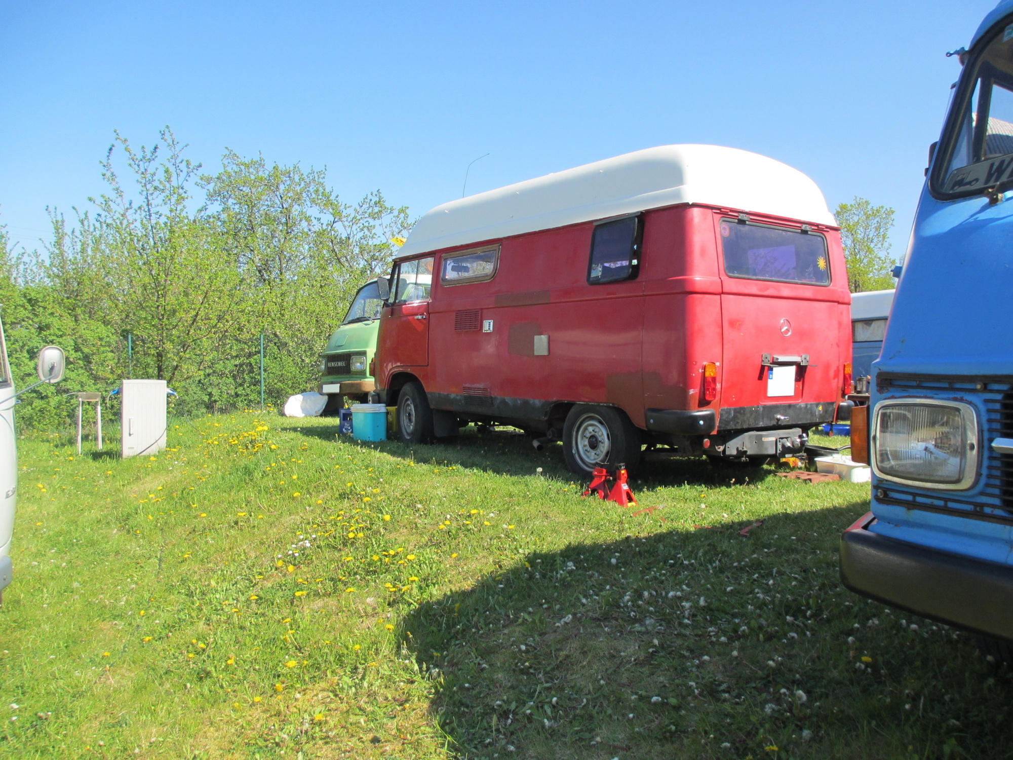 Gegenüber residierte Werner aus Unterfranken mit seiner Truppe und allein 5 Hanos. Werner ist ein in der Szene bekannter Schrauber, Ersatzteil-Sammler und Experte für alles Hano-mässige und besitzt laut eigener Aussage rund 30 Hanos. Werners Sohn kam auch gleich rüber, legte sich vorne unter den Bus und meinte "auch ein Kandidat für Zusatzfedern". Genau, die Zusatzfedern, die den Bus vorne etwas "hochheben" und damit mehr Bodenfreiheit verschaffen und so die Drehstabfedern entlasten, sollte ich auch mal einbauen. Ein Projekt für den Herbst oder Winter ...